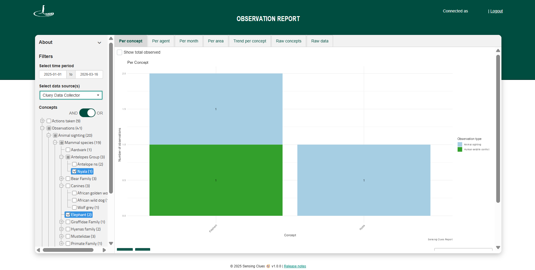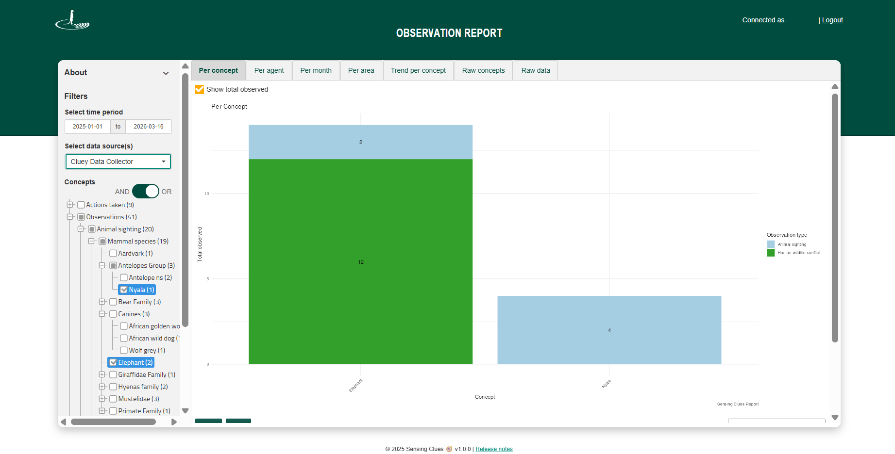 With this new option, you can switch to total observed, showing the total number of individuals recorded (e.g. there can be 2 observations of elephants, but a total of 14 individuals were seen):